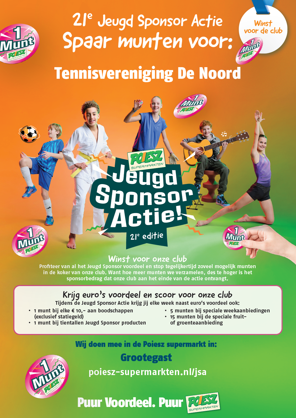 Spaar mee voor Tennisvereniging De Noord. Bij je boodschappen van de Poiesz ontvang je van 8 februari t/m 4 april Sponsormunten en onze koker, bij de Poiesz in Grootegast, lust deze erg graag.